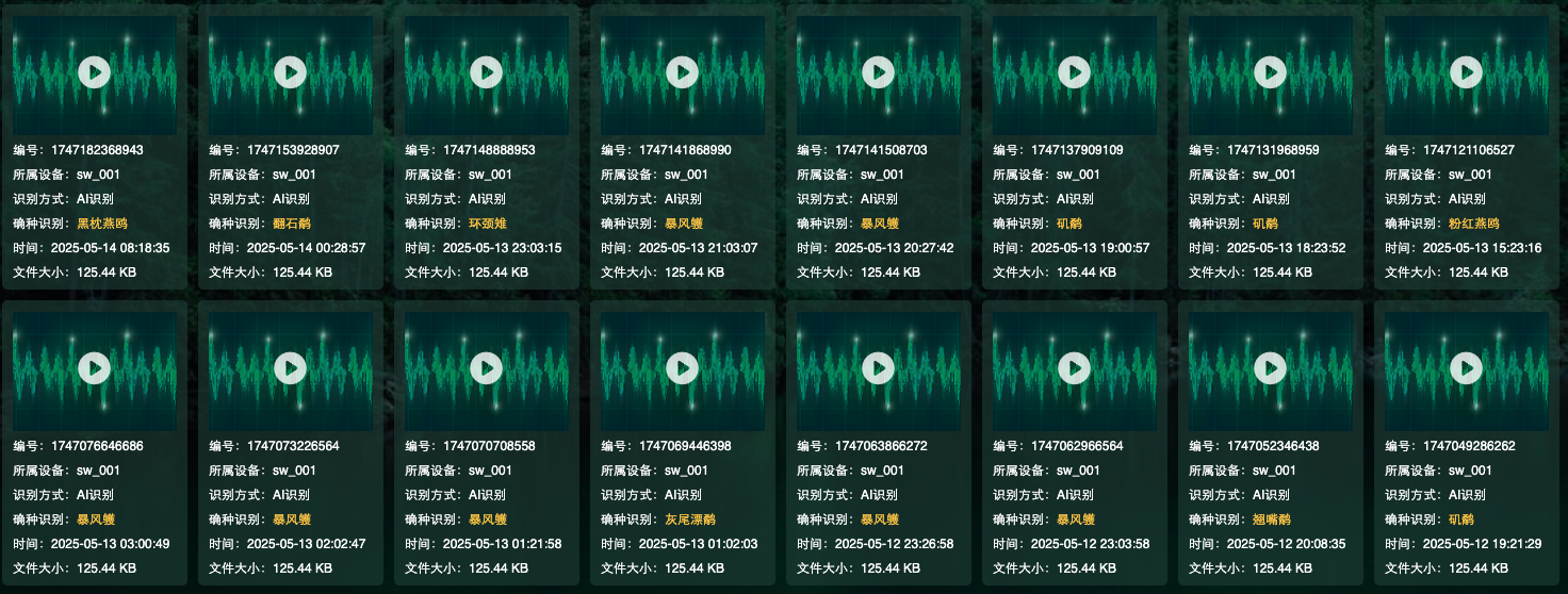 突破时空限制,实现全天候、全覆盖的动态监测能力,特别针对夜行性鸟类、隐蔽性鸟类及迁徙行为进行精准追踪,填补传统监测手段的数据空白。同时,通过建立结构化声纹数据库和多维度数据分析功能(如鸣声节律分析、繁殖行为评估等),为生态研究、气候变化影响评估及盗猎防控提供强有力的科学依据。最终,系统将与红外相机等视觉监测设备深度融合,形成“视觉+听觉”的多模态监测网络,全面提升生物多样性保护的智能化水平.